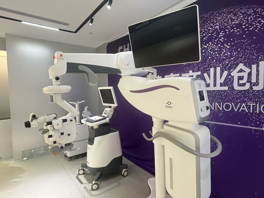 在全球健康产业创新中心的一层展厅,一些科技转化成果的具体案例在此呈现。首先映入眼帘的是图湃医疗的高端眼科医疗设备。