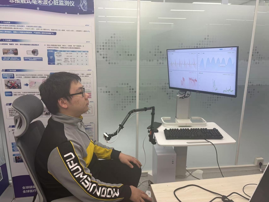 在全球健康产业创新中心的地下一层,记者见到了科技成果转化的“正在进行时”。这里有共享实验室,也有创业公司的独立实验室,来自多个北京院校的科研团队此刻在攻关研究。北京邮电大学计算机学院教授周安福与团队成员现场展示了他们研发的非接触心脏健康监测仪:只见被试者安静地坐在设备前,无需佩戴任何传感器或接触电极,仪器便可通过毫米波信号实时捕捉其心脏细微的跳动变化,相关数据同步呈现在屏幕上,心律等指标清晰可见。